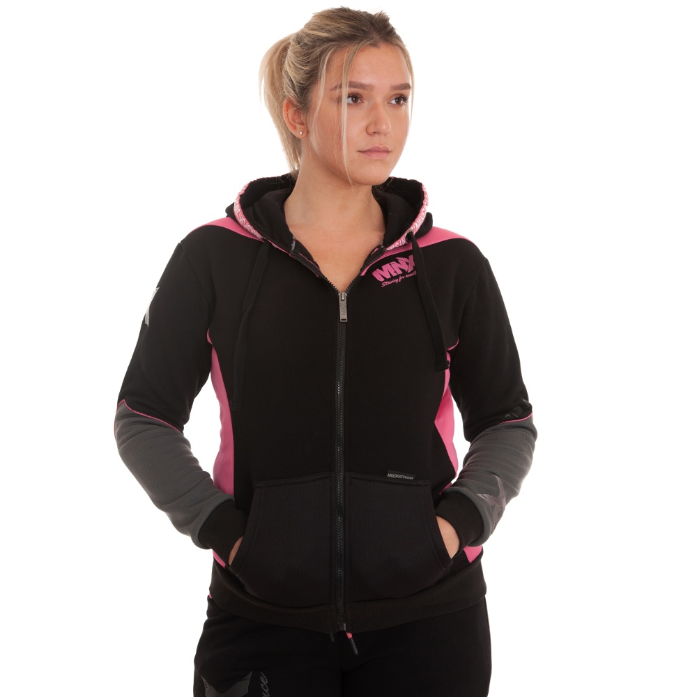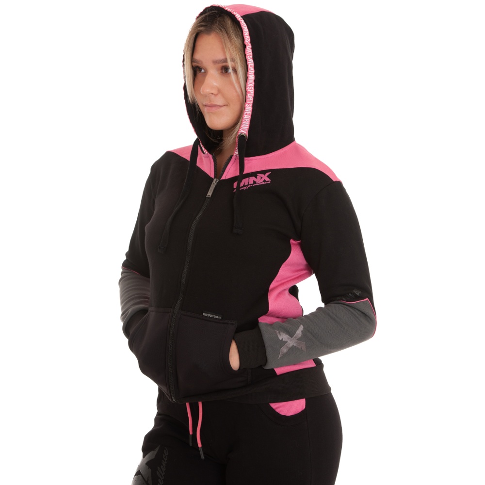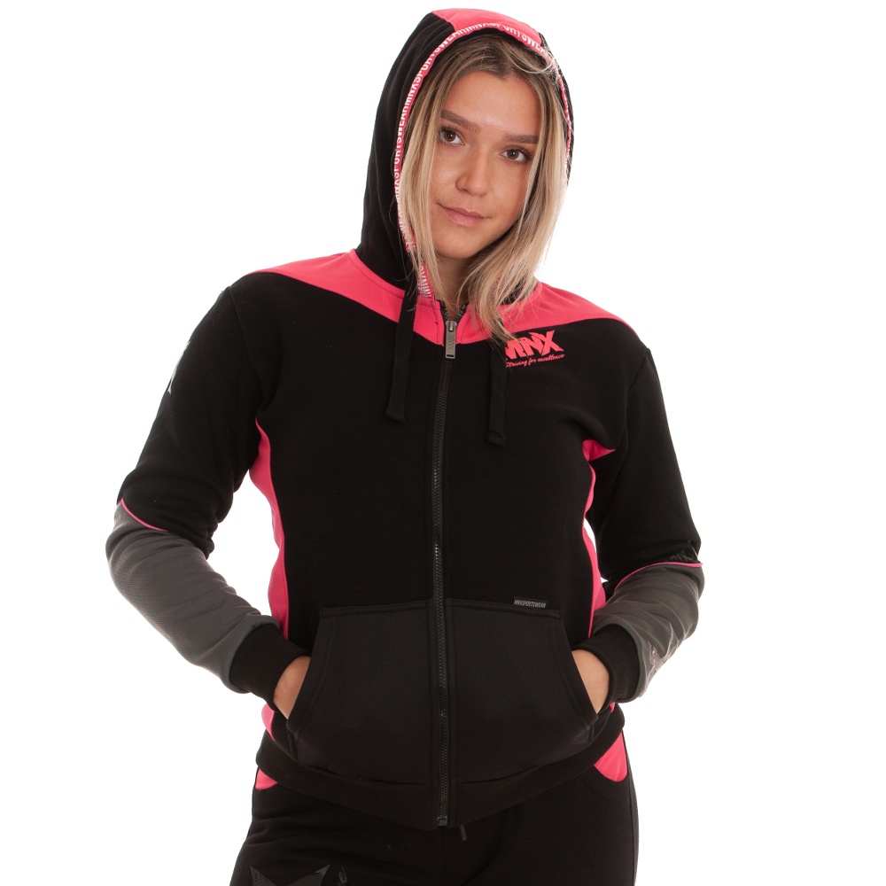 MNX women’s hoodie Revolution is the perfect addition to any wardrobe. With a unique design and MNX branding, you will surely turn heads. This hoodie is made of soft and warm cotton and features mesh sections for a special visual effect. Embroidered “X” on both sleeves and rubber MNX logo on front and left sleeve. Printed MNX logo on both sleeves and metallic MNX zip puller. Adjustable drawcord comes with the new designed MNX plastic tips.